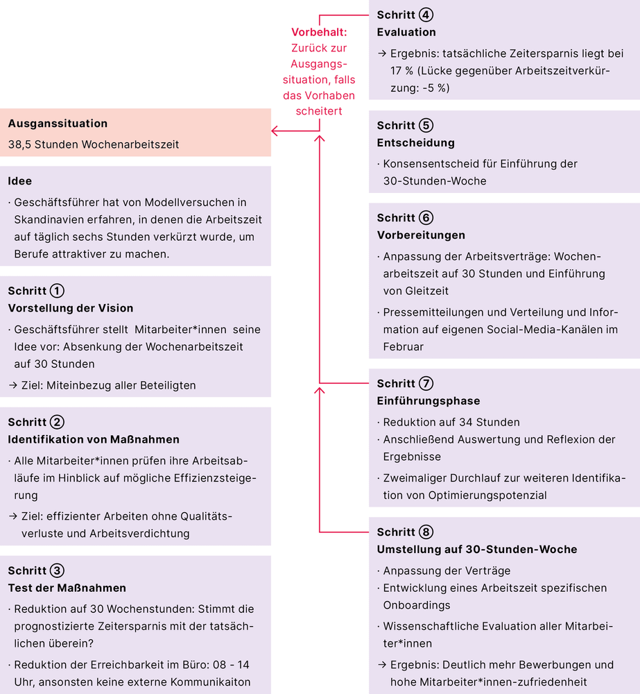 Deshalb beschließt Klaus, die Stunden gestaffelt zu reduzieren. Falls während der Einführung klar werden sollte, dass es nicht funktioniert, könnte die Agentur zurück in den Ausgangsmodus.