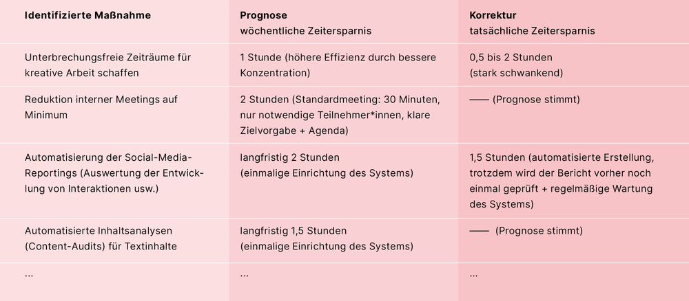 In der Evaluationsphase haben die Mitarbeiter*innen die sechswöchige Testphase ausgewertet. Zusammengerechnet konnten durch die Maßnahmen 17 Prozent der Zeit eingespart werden. Das ist zwar viel, aber nicht so viel, wie eine Reduktion von 38,5 auf 30 Wochenstunden bedeuten würde. Vorläufiges Ergebnis war, dass sich fünf Prozent wohl nicht ausgleichen lassen.