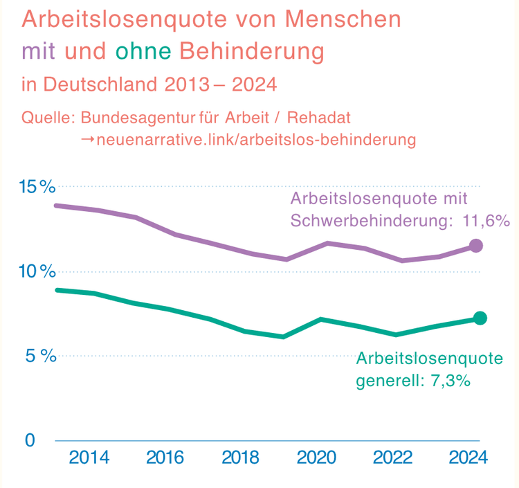 Viele Menschen mit Behinderungen machen ähnliche Erfahrungen. Die aktuelle Arbeitsmarkt-Studie von Aktion Mensch und dem Handelsblatt Research Institute zeigt: Es gibt immer weniger Inklusion auf dem Arbeitsmarkt. 2024 war ungefähr jede achte Person mit Behinderungen arbeitslos1. Seitdem ist die Arbeitslosigkeit bei Menschen mit Behinderungen noch weiter gestiegen.
