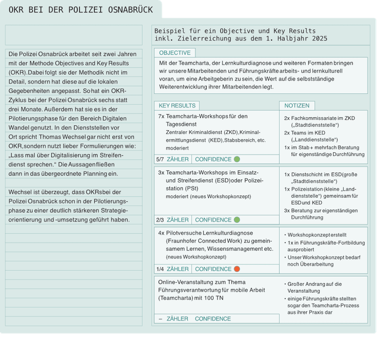 Die Polizei Osnabrück arbeitet seit zwei Jahren mit der Methode Objectives and Key Results (OKR). Dabei folgt sie der Methodik nicht im Detail, sondern hat diese auf die lokalen Gegebenheiten angepasst. So hat ein OKR-Zyklus bei der Polizei Osnabrück sechs statt drei Monate. Außerdem hat sie es in der Pilotierungsphase für den Bereich Digitalen Wandel genutzt. In den Dienststellen vor Ort spricht Thomas Wechsel gar nicht erst von OKR, sondern nutzt lieber Formulierungen wie: „Lass mal über Digitalisierung im Streifendienst sprechen.“ Die Aussagen fließen dann in das übergeordnete Planning ein.